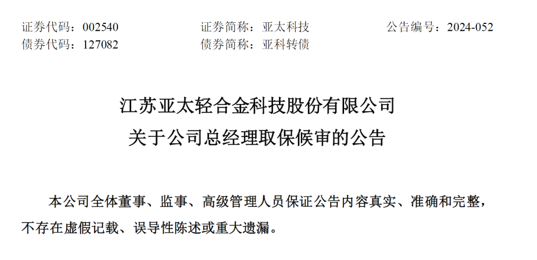 公告显示,公司于近日收到董事、总经理兼子公司亚太轻合金(南通)科技有限公司(简称“亚通科技”)总经理浦俭英的通知,江苏省海安市公安局于2024年6月19日出具《取保候审决定书》,因安全事故侦查所需,决定对子公司亚通科技总经理浦俭英取保候审,期限从2024年6月19日起算。亚通科技在公告中表示,目前浦俭英能够正常履职,公司及子公司亚通科技生产经营情况正常。